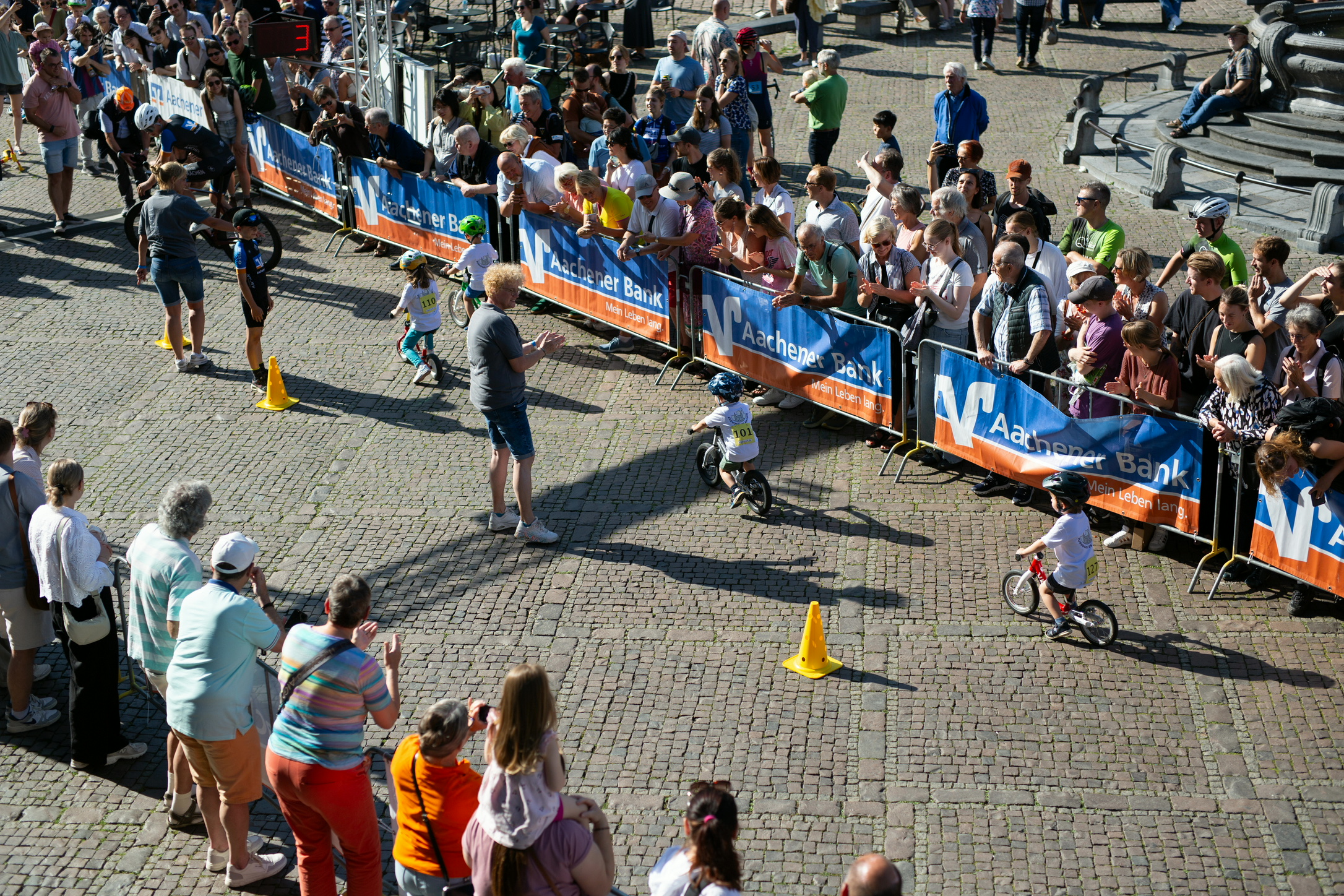 Selbstverständlich gab es auch dieses Jahr wieder das Laufradrennen, dieses Mal für 2- bis 4-Jährige. Beim „NetAachen Kids Cup“ fuhren sie die Zielgerade am Markt entlang, wobei sie kräftig angefeuert wurden.